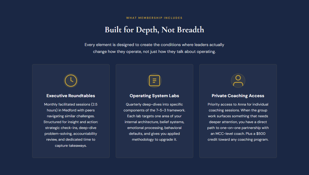 This isn't a networking group. It's not a masterclass you watch passively. It's a structured environment where accomplished leaders do the internal work that most leadership programs skip entirely, then pressure-test that work with peers who understand the weight of senior leadership.
